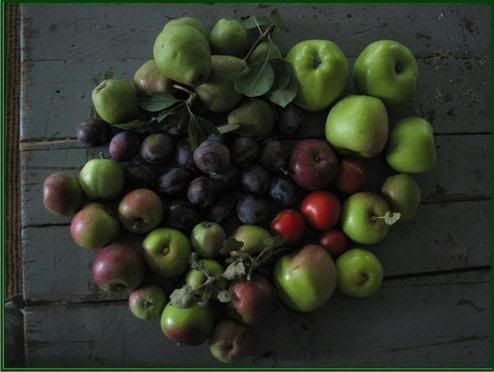 de eerste oogst van diverse peren en appels pruimen en tomaten.